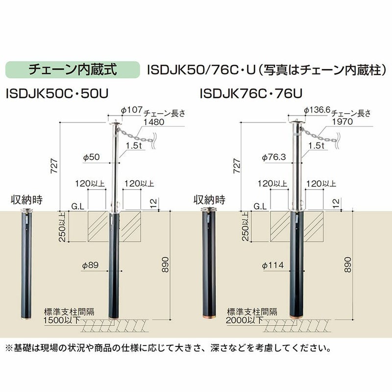 5. 【車止め】モダンスポール 上下式 チェーン内蔵柱 φ50 ポール本体(1本) ISRPS-DJK50C
