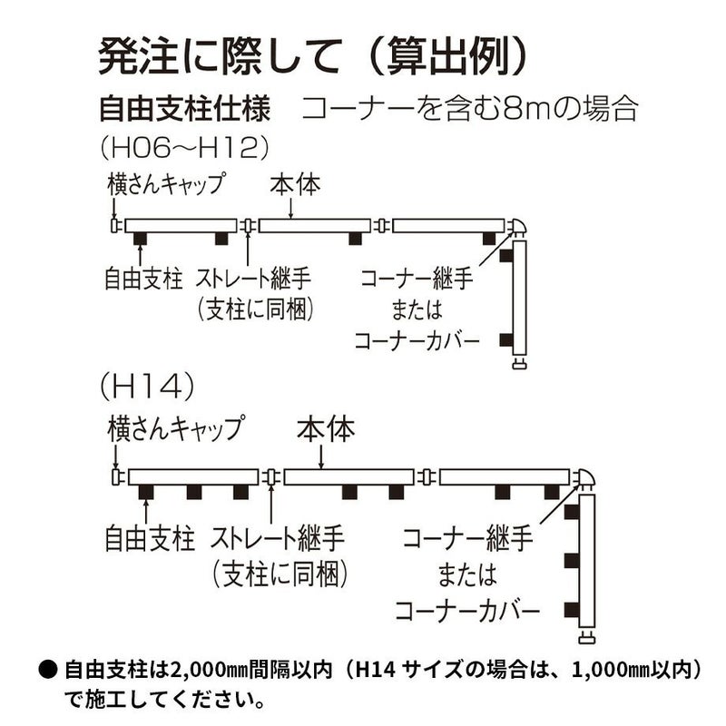 ● 自由支柱は2,000㎜間隔以内(H14 サイズの場合は、1,000㎜以内)で施工してください。
