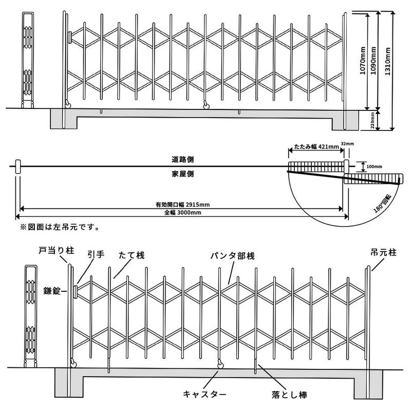 | サイズ(mm) | 全体幅:3000mm 高さ:1090mm 本体幅(奥行):100mm たたみ幅:421mm |