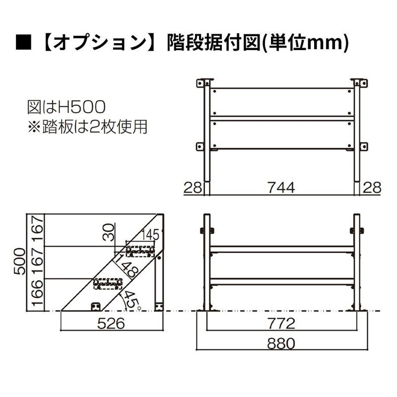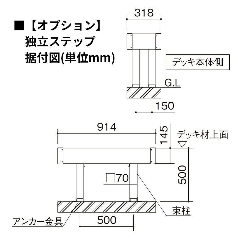 オプション:独立デッキステップ据付図(単位mm)